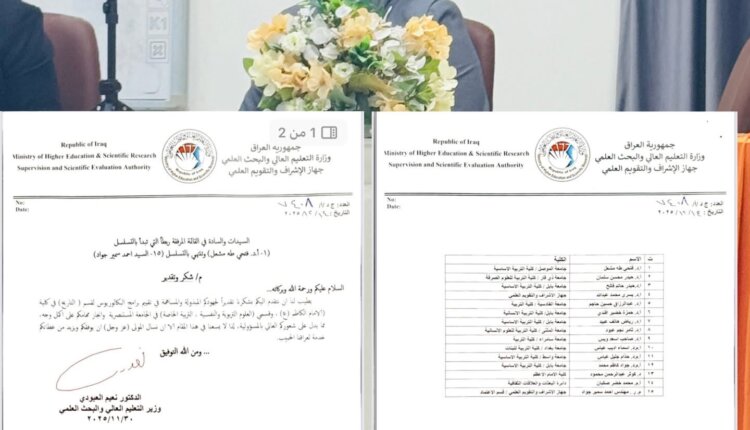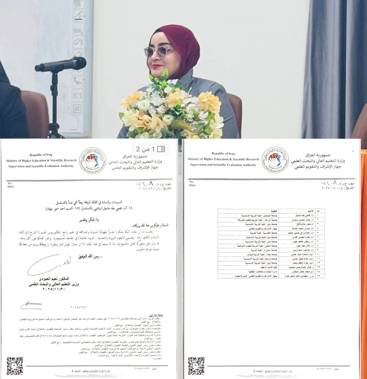 حصدت التدريسية في كلية الإمام الأعظم الجامعة، الأستاذة الدكتورة كوثر عبد الرحمن محمود، تكريماً علمياً رفيعاً تمثل بحصولها على كتابي شكر وتقدير من معالي وزير الثقافة ومعالي وزير التعليم العالي والبحث العلمي، تثميناً لجهودها البحثية ودورها في جودة التعليم.