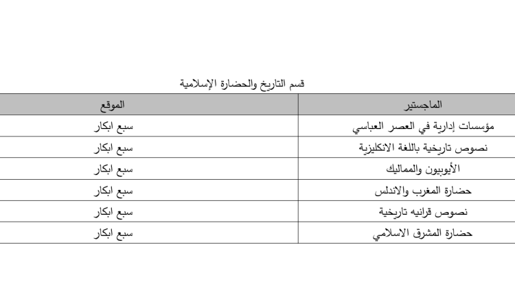 جدول امتحانات قسم التاريخ والحضارة الإسلامية بغداد / ماجستير