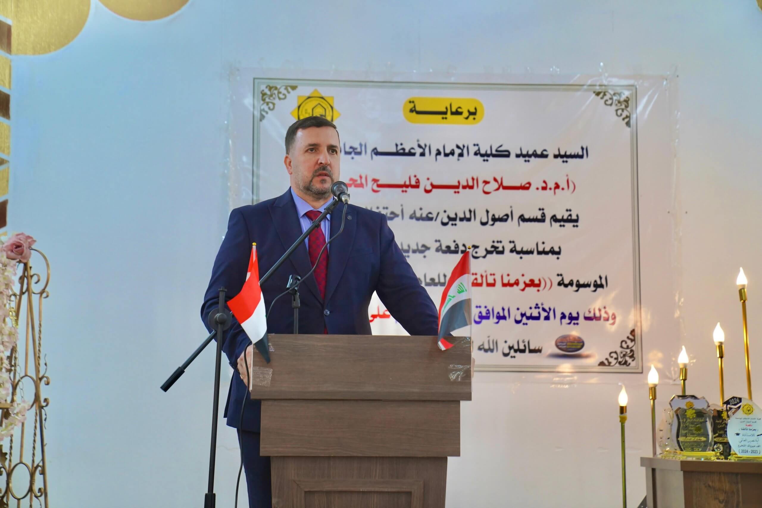 ابتدأ الحفل بتلاوة آي من الذكر الحكيم ثم كلمة للسيد عميد الكلية هنأ ابنائه الطلبة المتخرجين وعوائلهم الكريمة على قطف ثمار الجهد والسهر بأن توّج أبنائهم اليوم بالتخرج والحصول على شهادة البكالوريوس في تخصص اصول الدين شاكراً عوائل الطلبة الّذين قدموا جهوداً كبيرة وواصلوا الليل بالنهار وهم يدعمون أبنائهم وبناتهم لأجل قطف ثمار التخرج