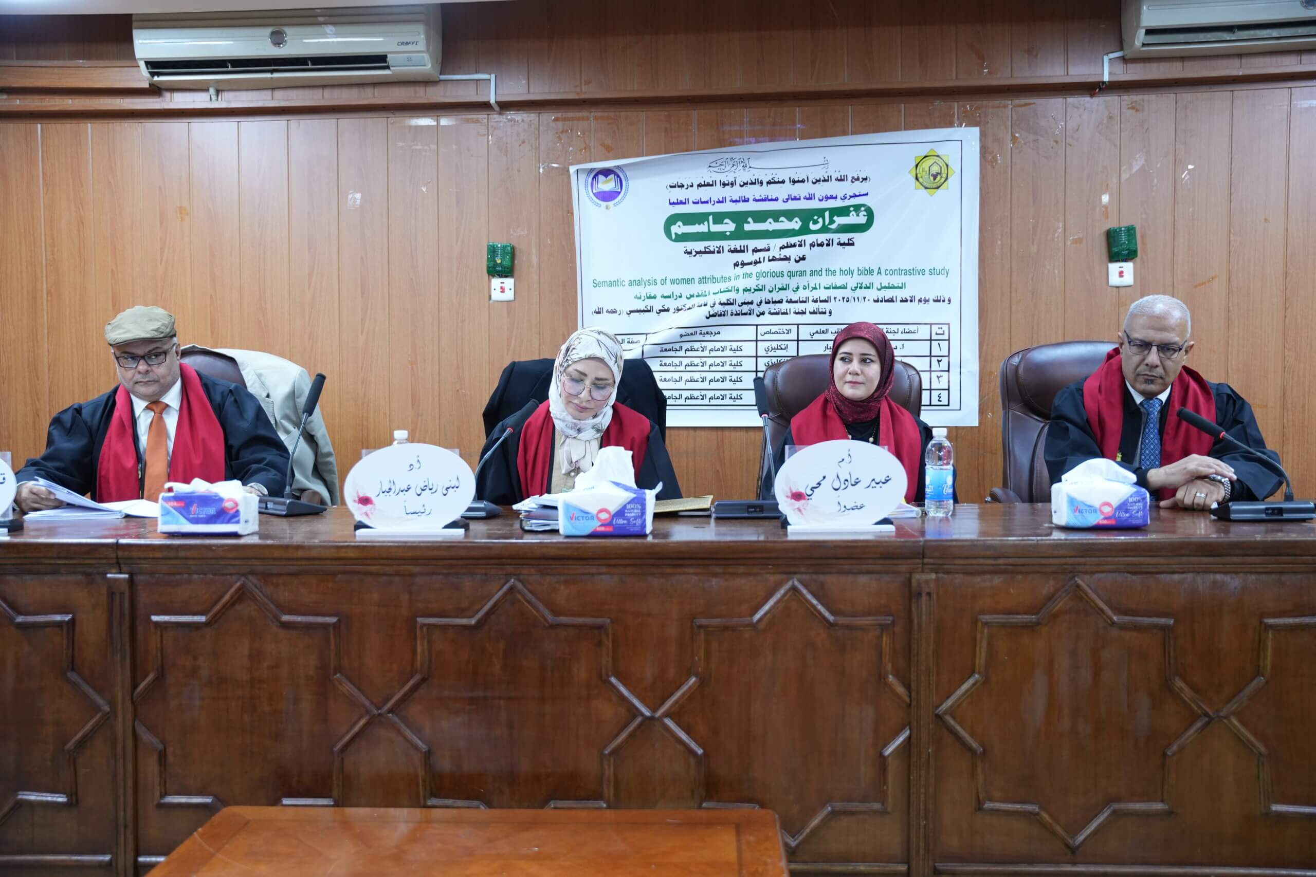 أُجْريتْ يومَ الخميس ٢٠٢٥/١١/٢٠ المناقشةُ العلنيَّةُ لطالبِة الماجستير في قسم الدراسات الإسلامية باللغة الإنجليزية (غفران محمد جاسم)، وذلكَ في قاعة الدكتور مكي الكبيسي -رَحمهُ اللهُ- في السبع ابكار ، في رسالتها الموسُومة [التحليل الدلاليّ لصفات المرأة في القرآن الكريم والكتاب المقدس دراسة مقارنة ] وبعد مُناقشةِ الرسالة وما احْتوتْهُ من السَّادةِ الأعضاءِ مُناقشةً مُستفيضةً نالتِ الرسالة القبولَ، بتقديرِ مُسْتوفٍ.