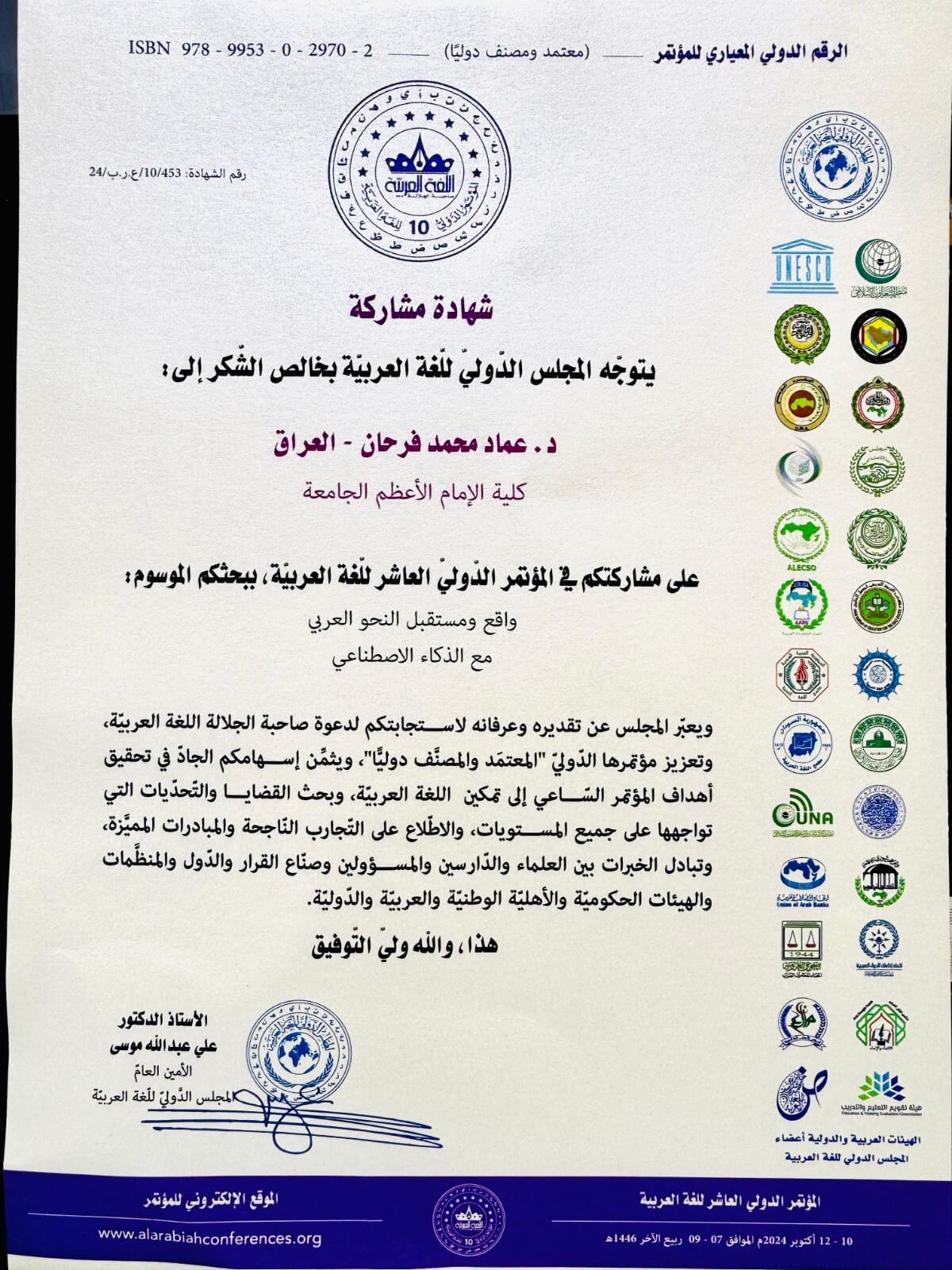 شَاركَ الأُسْتاذُ الدُّكتورُ عِمادُ محمَّد فرحان، التَّدريسيُّ في قسْمِ أُصولِ الدِّين في الفلُّوجةِ في المُؤتَمَرِ الدَّوليِّ العاشِرِ لِلُّغةِ العربيَّةِ، الذي أُقيْمَ برعايةِ الشَّيخِ محمَّد بن راشِد آل مَكْتوم في دُبَي، بِبَحْثِهِ المَوسُوم بــ( واقِعُ ومُسْتقبلُ النَّحْوِ العربيَّ معَ الذَّكاءِ الاصْطِناعيِّ )، كما دُعيَ الدُّكتورُ عمادُ إلى إدارةِ جَلْسَةٍ علميَّةٍ في المُؤتَمَر.
