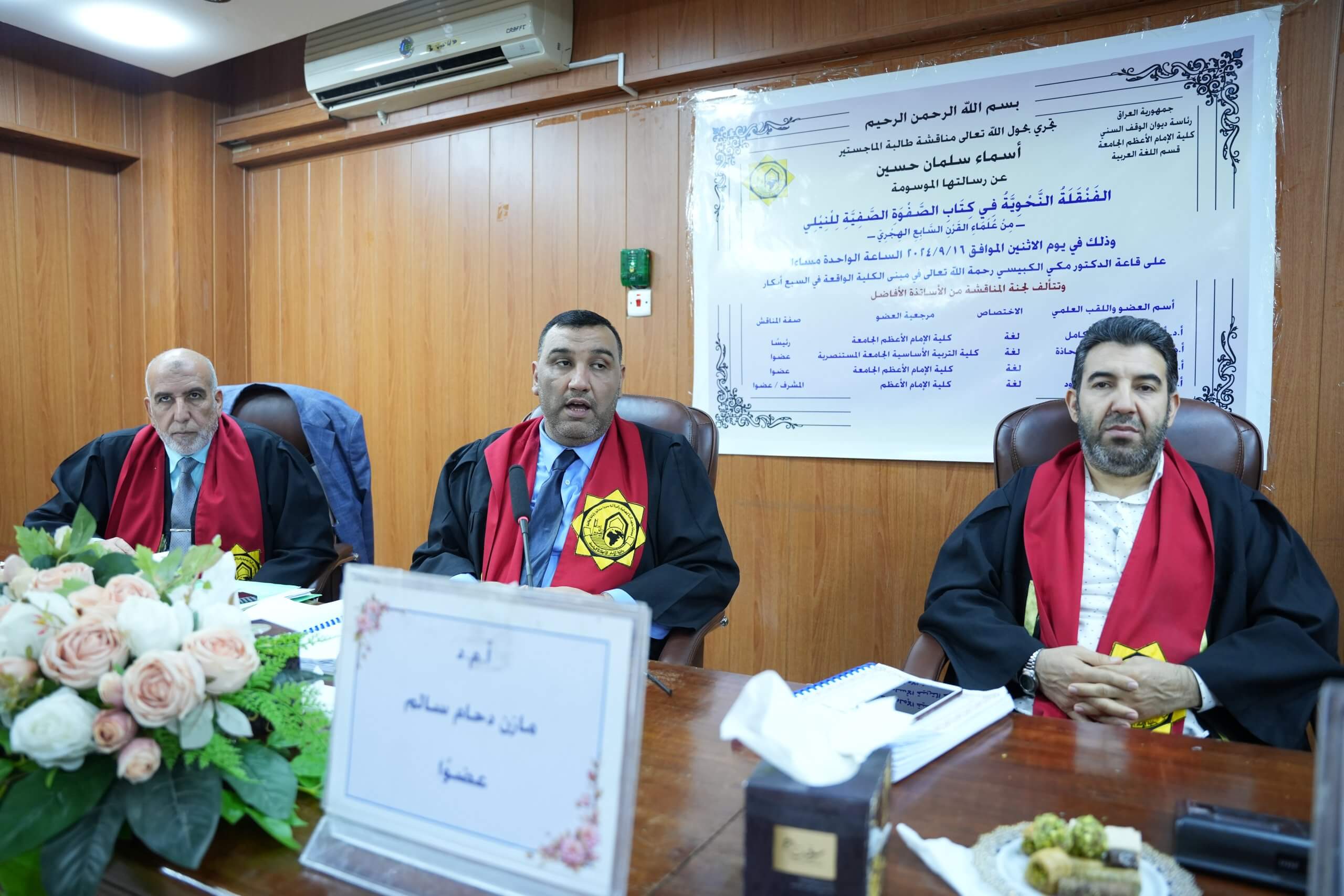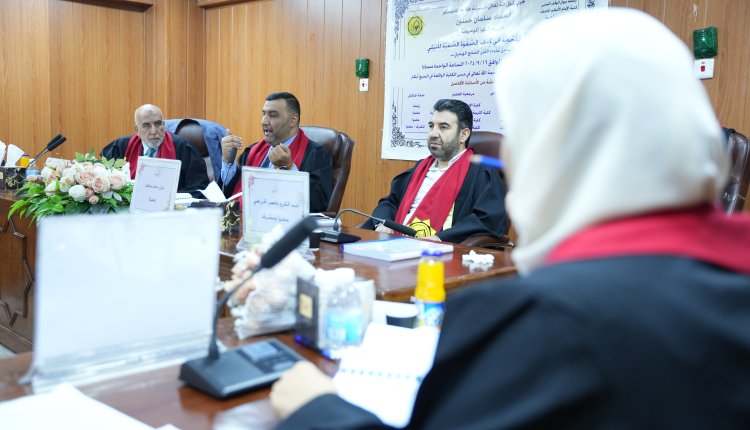 On Monday, 16th September, 2024, a public discussion was held for the master’s student (Asmaa Salman Hussein) in the Department of Arabic Language. This took place in the hall of Dr. Maki Al-Kubaisi (may Allah have mercy on him) in the Sab’a Abkar building. Her thesis, titled “The Grammatical Transference in the Book of Al-Safwah Al-Safiyyah by Al-Nili – a Scholar of the17th Hijri Century,” was thoroughly discussed by the esteemed committee members. After an extensive discussion of the thesis and its contents, it was accepted with a satisfactory grade.